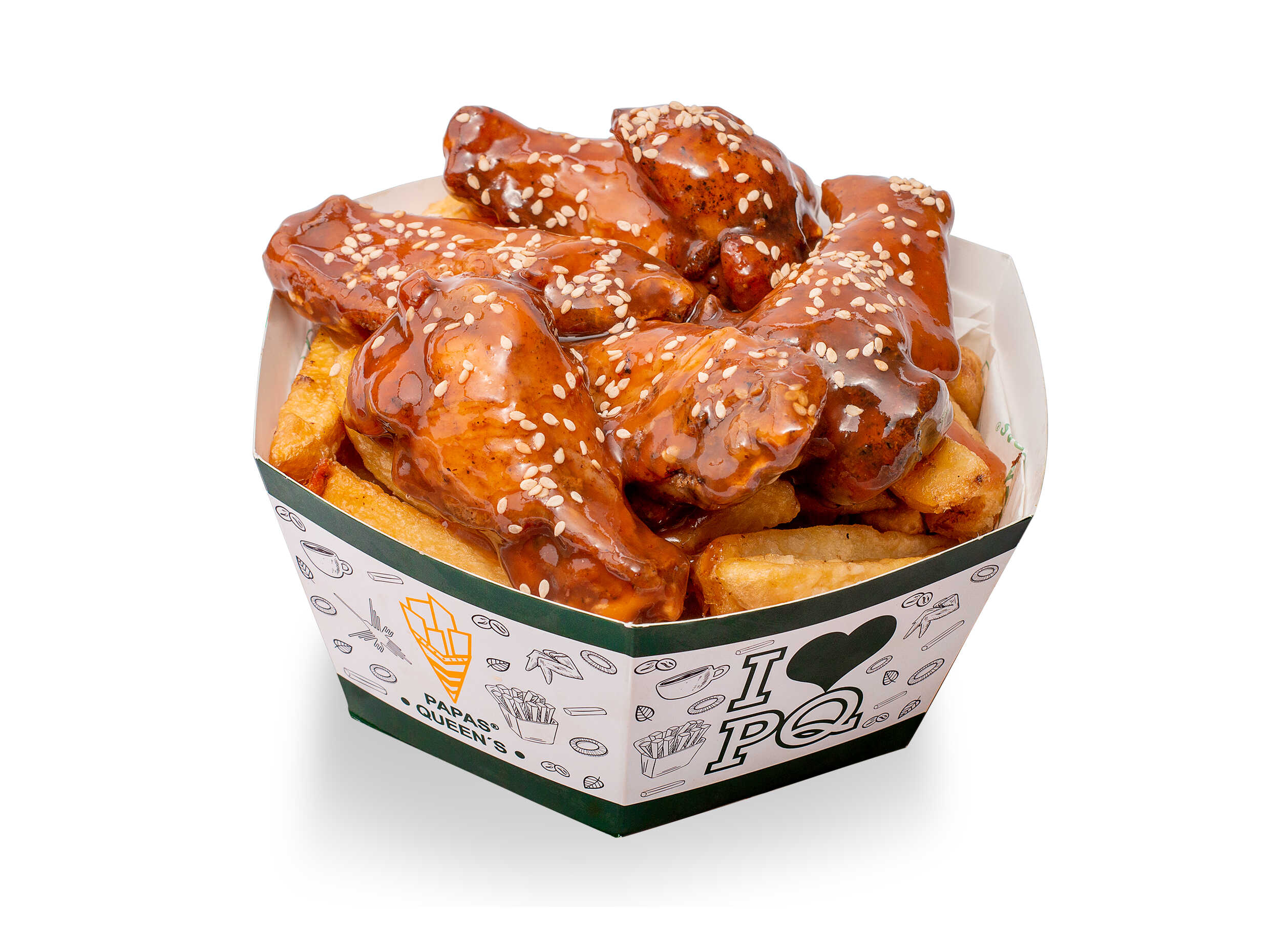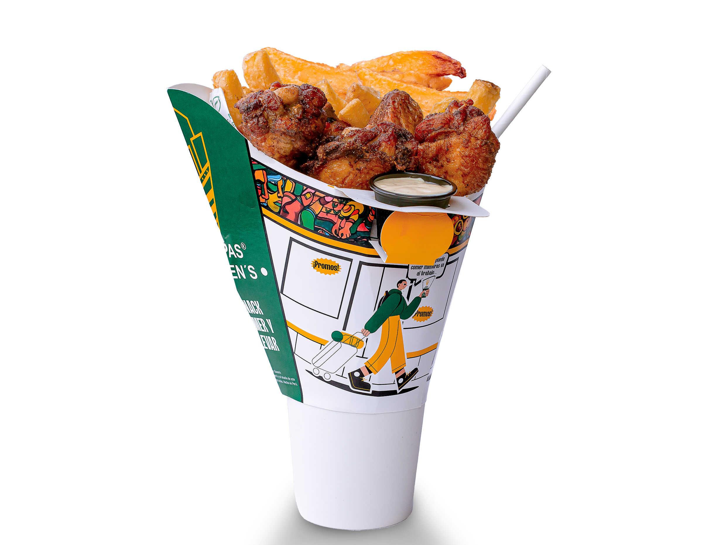 Todos nuestros conos vienen con papas artesanales, cremas y bebidas de 12 oz. Alitas en salsa BBQ más chicken finger.
