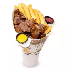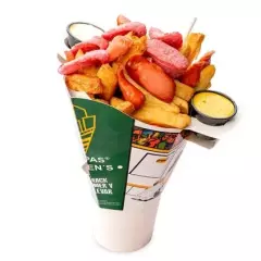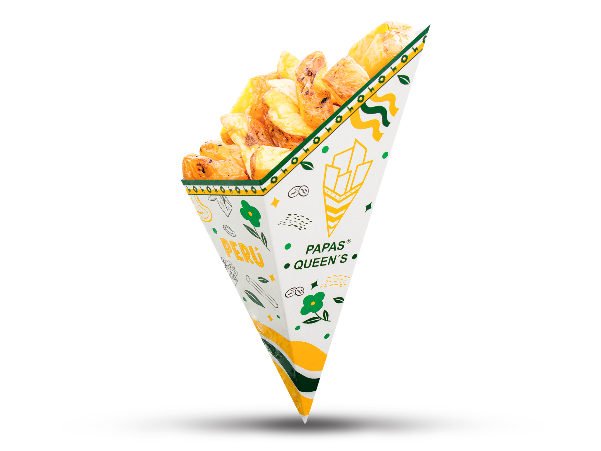 Todos nuestros conos vienen con papas artesanales, cremas y bebidas de 12 oz. Anticucho más mollejas salteadas.