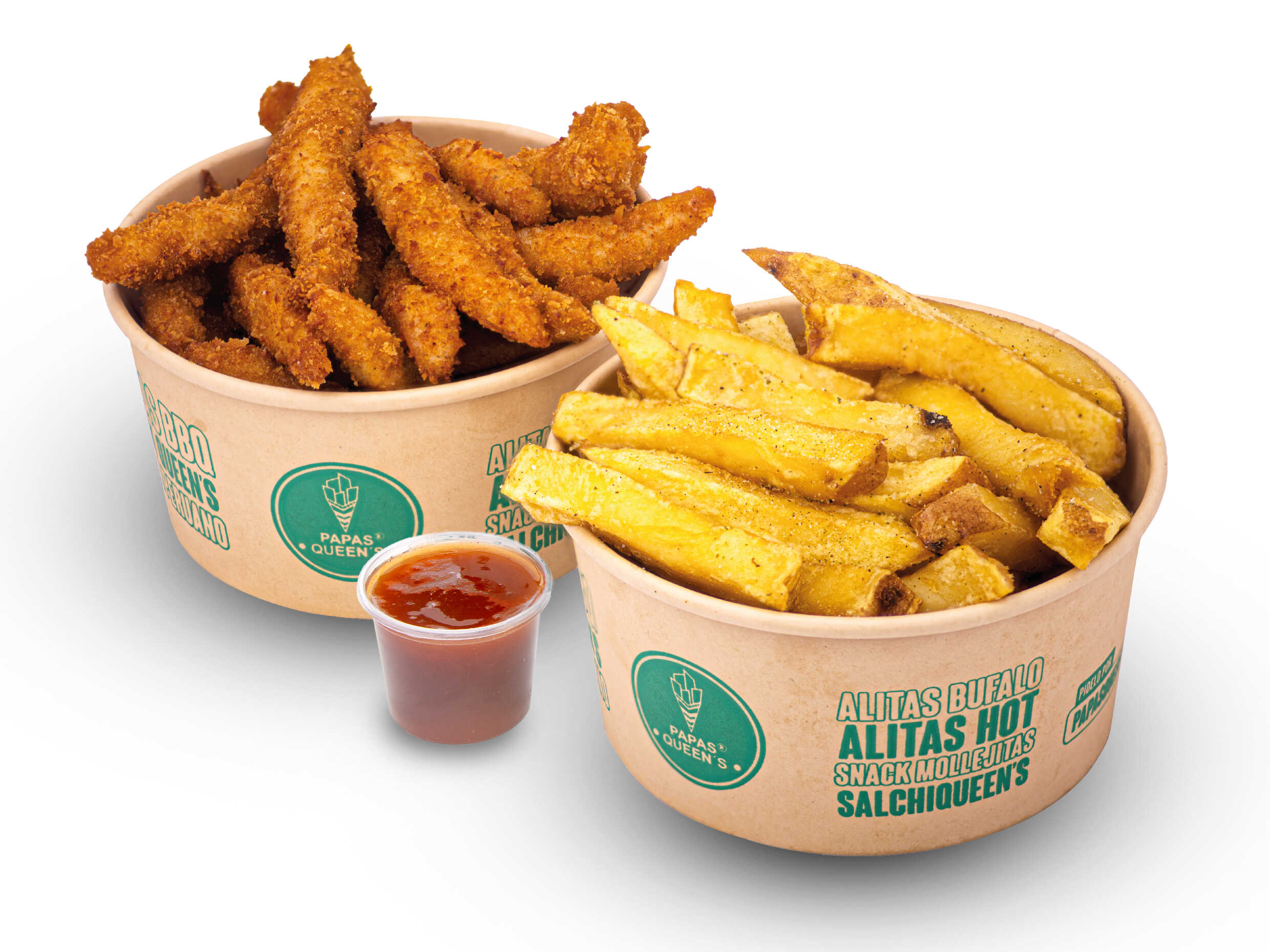 Papas nativas, salsas y cremas a elección. 12 Chicken fingers más salsa BBQ.