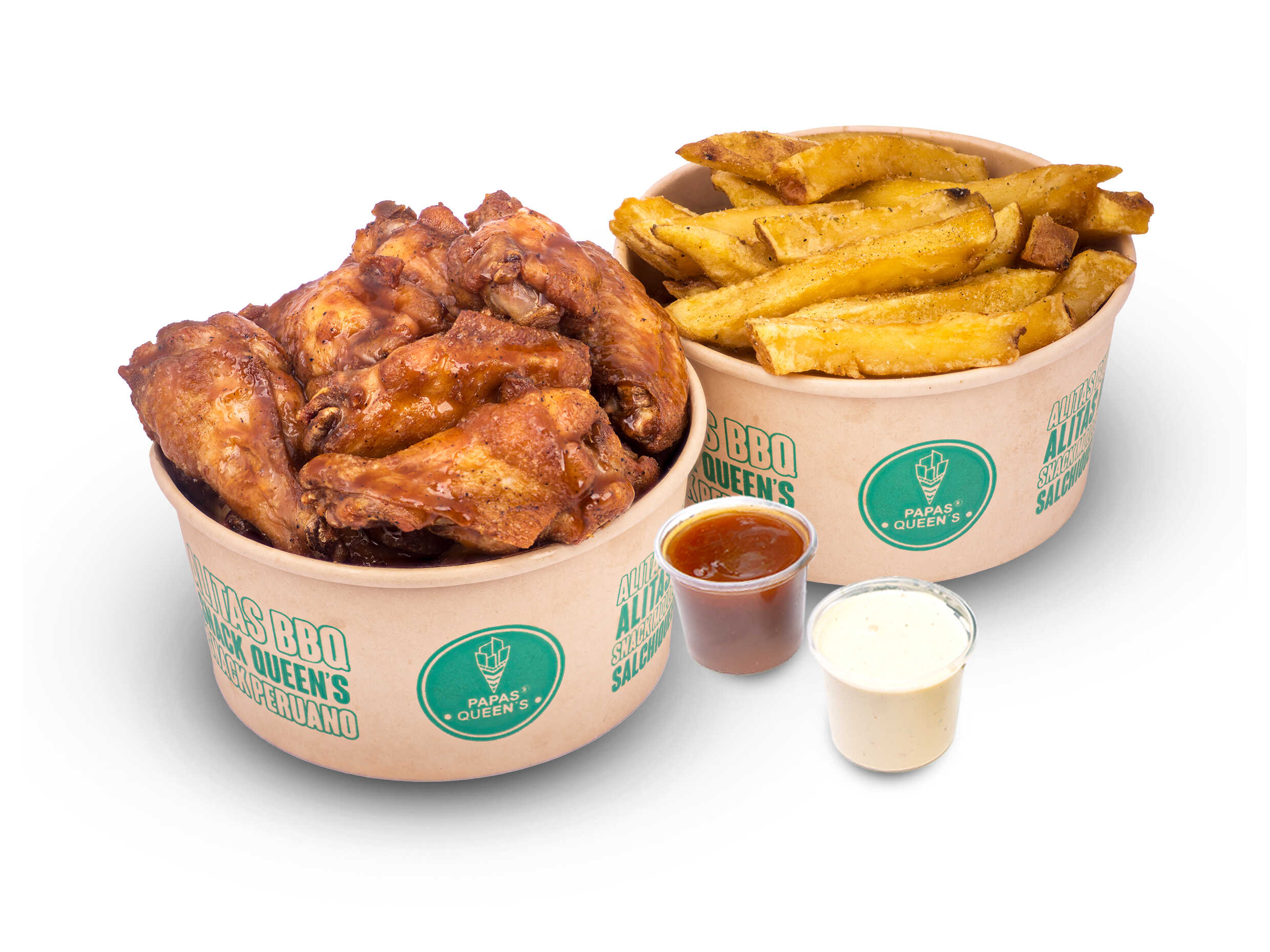 Papas nativas, salsas y cremas a elección. 24 Alitas clásicas, 3 salsas a elección más 4 bebidas.