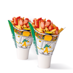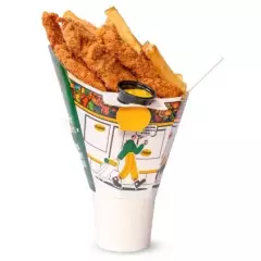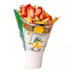 Todos nuestros conos vienen con papas artesanales, cremas y bebidas de 12 oz. Hot dog de ternera suiza más trozos de pollo crispy.