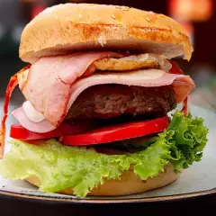 Jugosa carne, queso edam, tocino, lechuga, tomate, salsa de la casa más esponjoso pan de la casa.