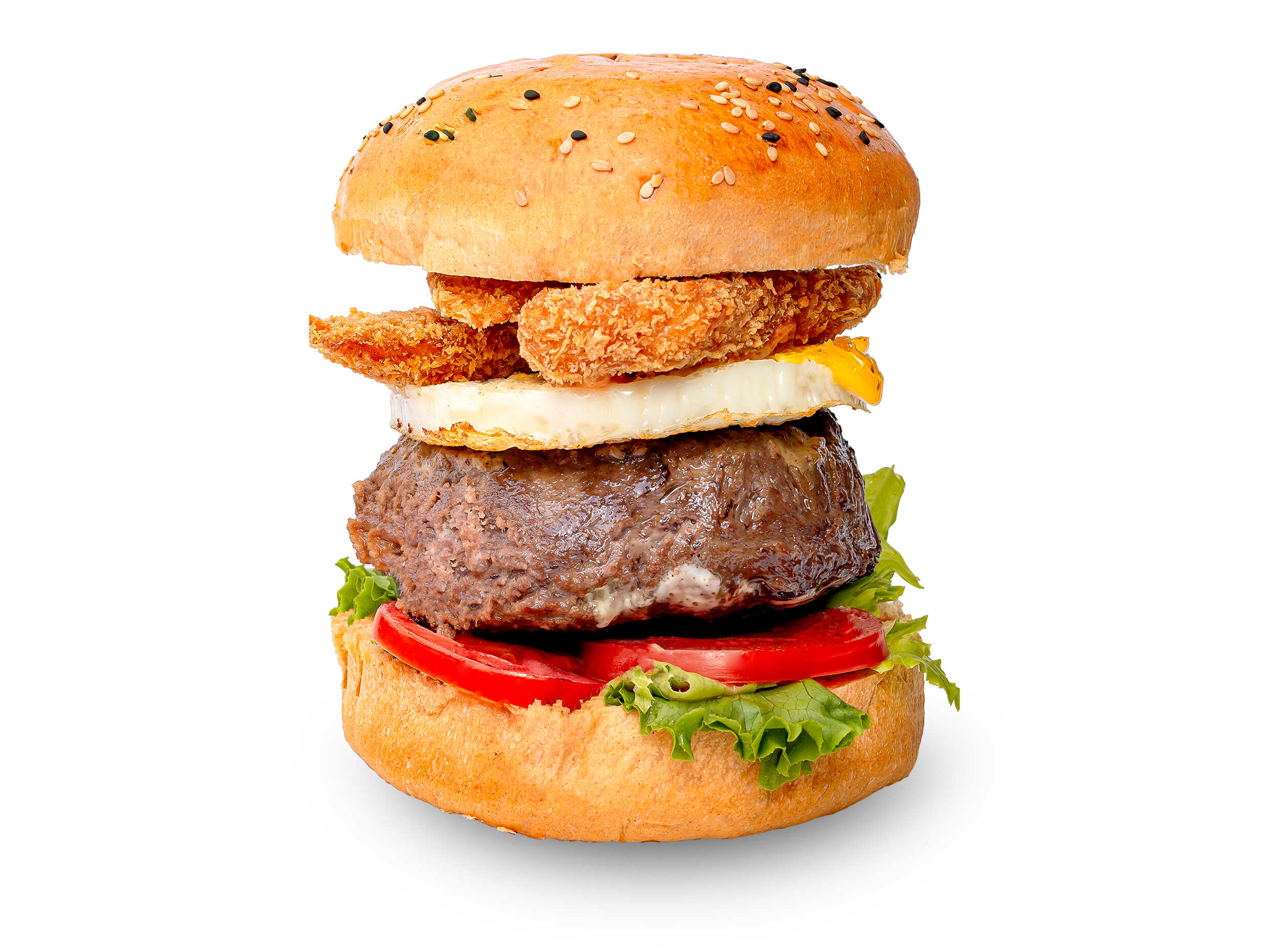 Jugosa carne, tocino, queso edam, jamón, huevo, lechuga, tomate, salsa de la casa más esponjoso pan de la casa.