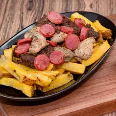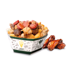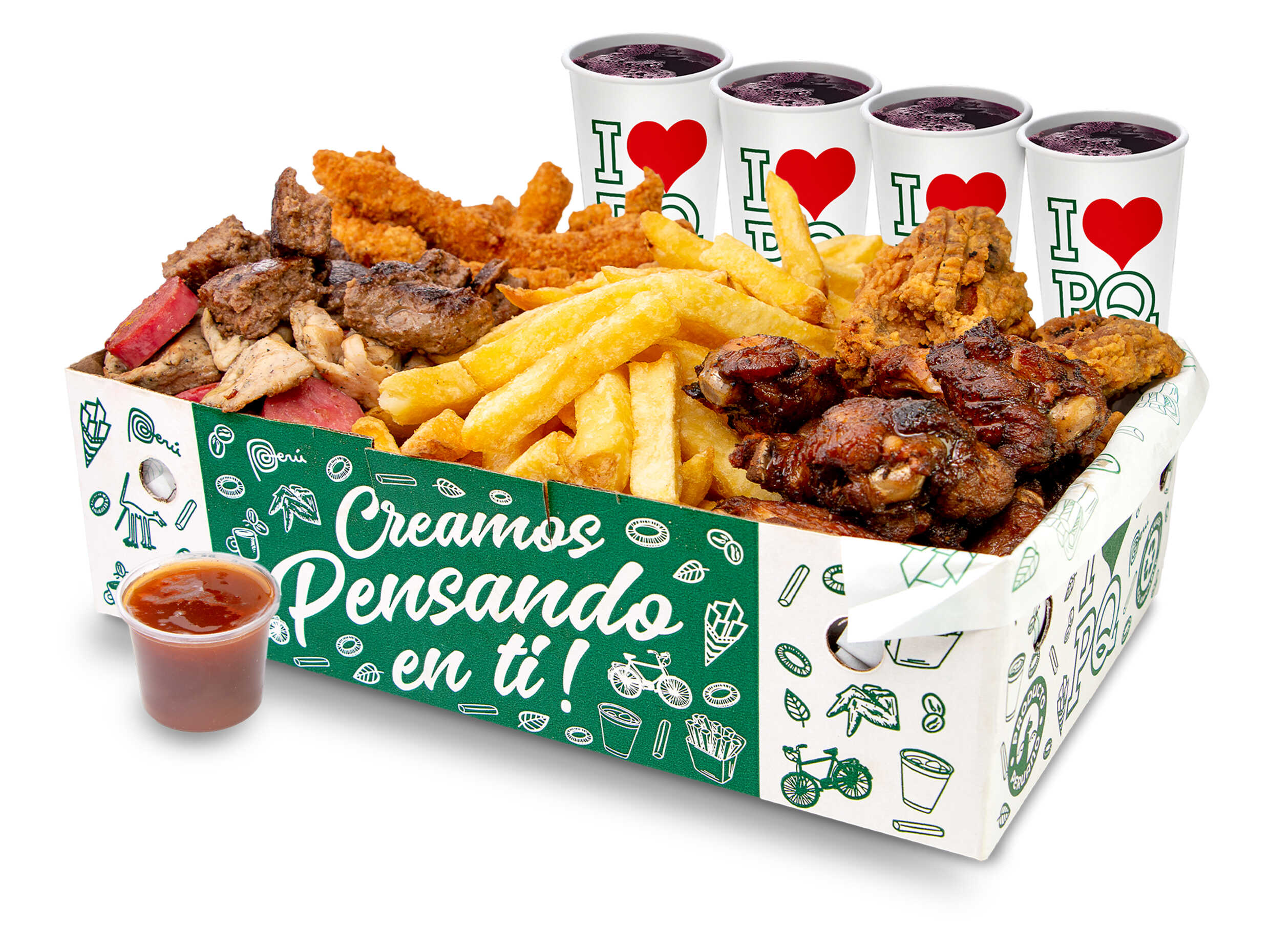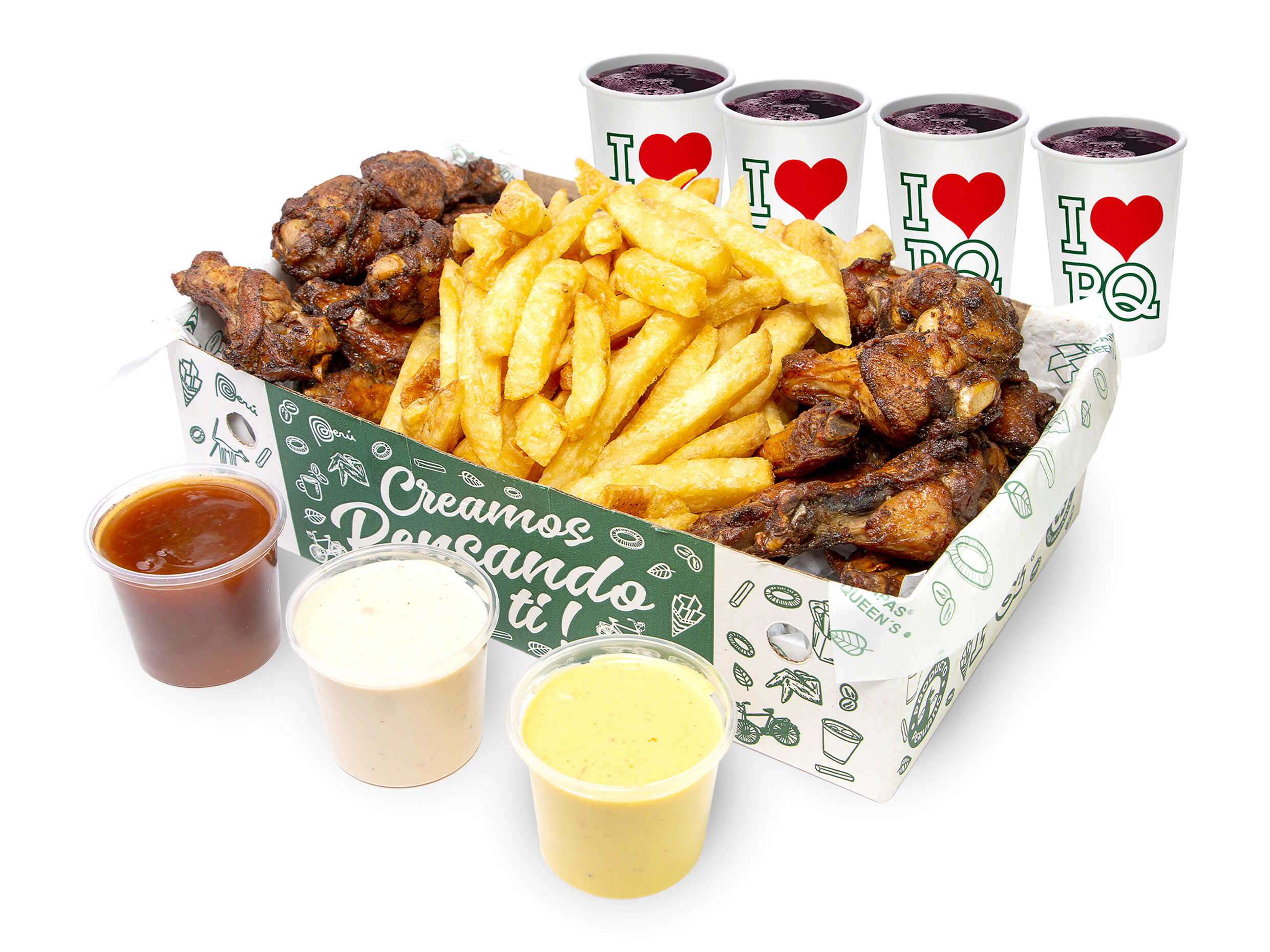Papas nativas, salsas y cremas a elección. 6 Alitas BBQ, 7 chicken fingers, 6 alitas crunch, chorizo, pollo parrillero, hamburguesa, salsa BBQ más 4 bebidas.