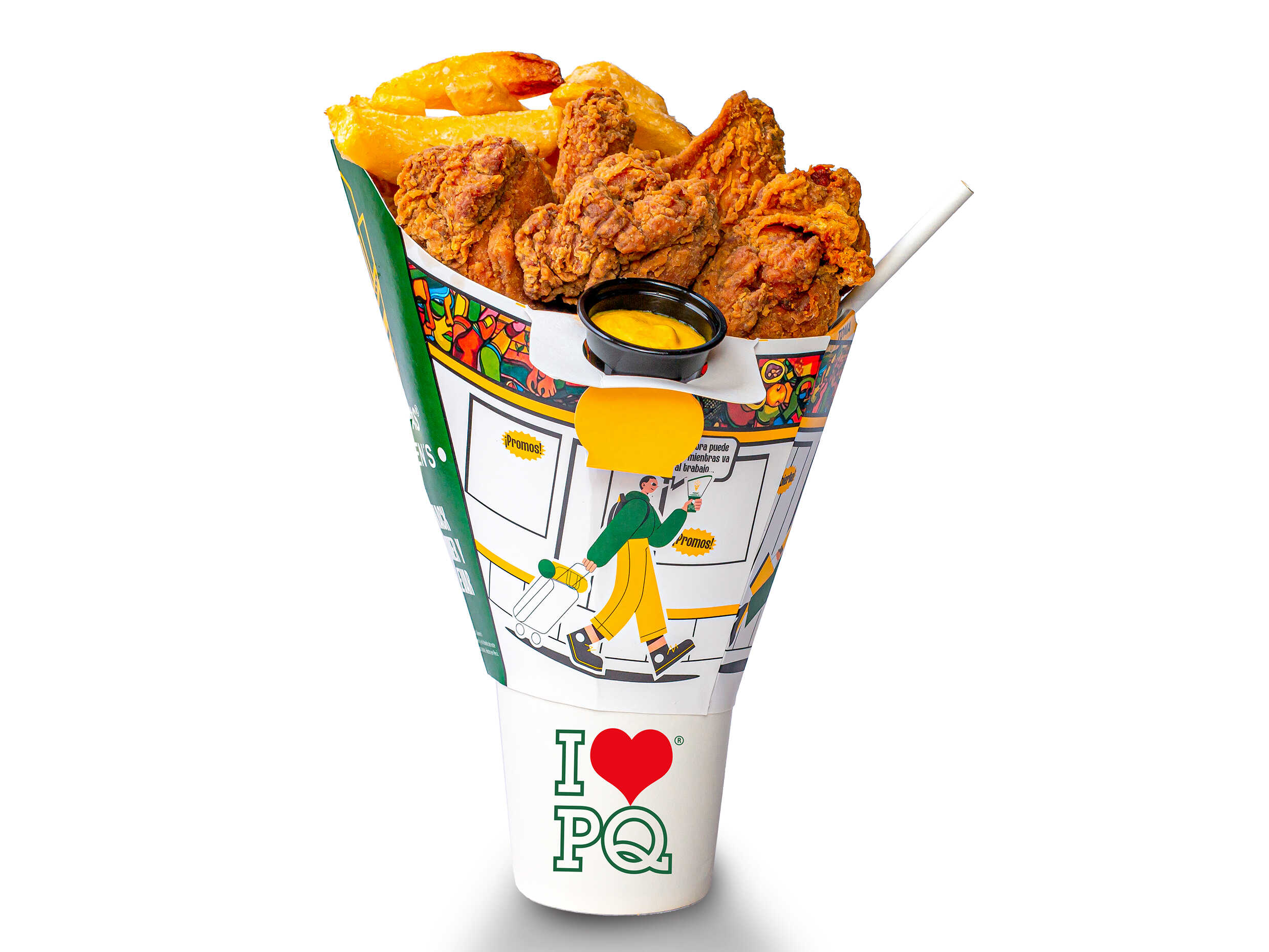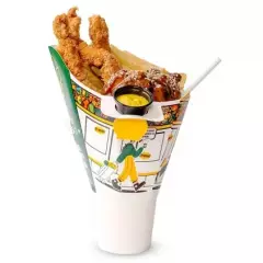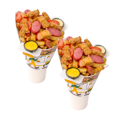 Todos nuestros conos vienen con papas artesanales, cremas y bebidas de 12 oz. Chicken finger.