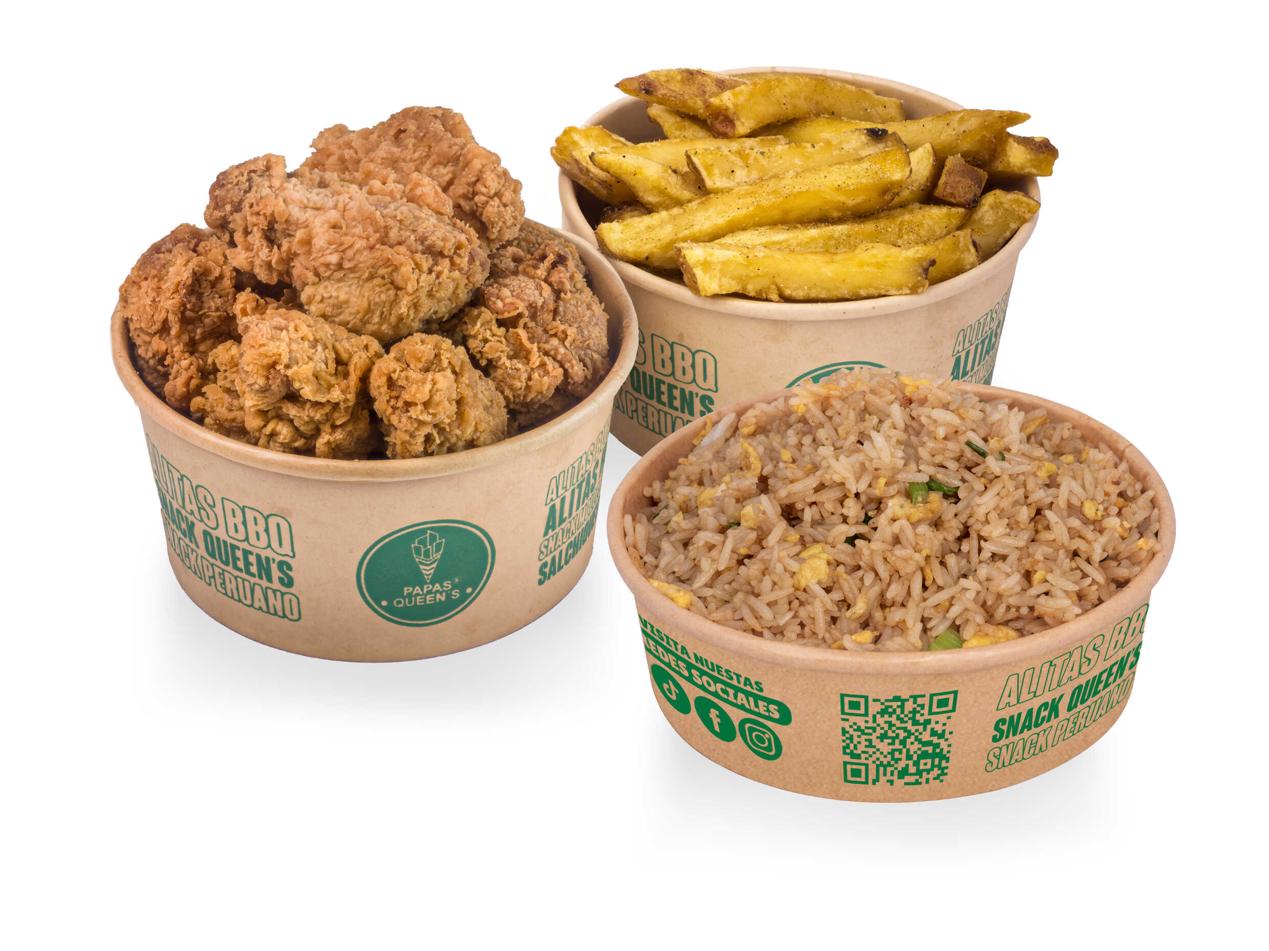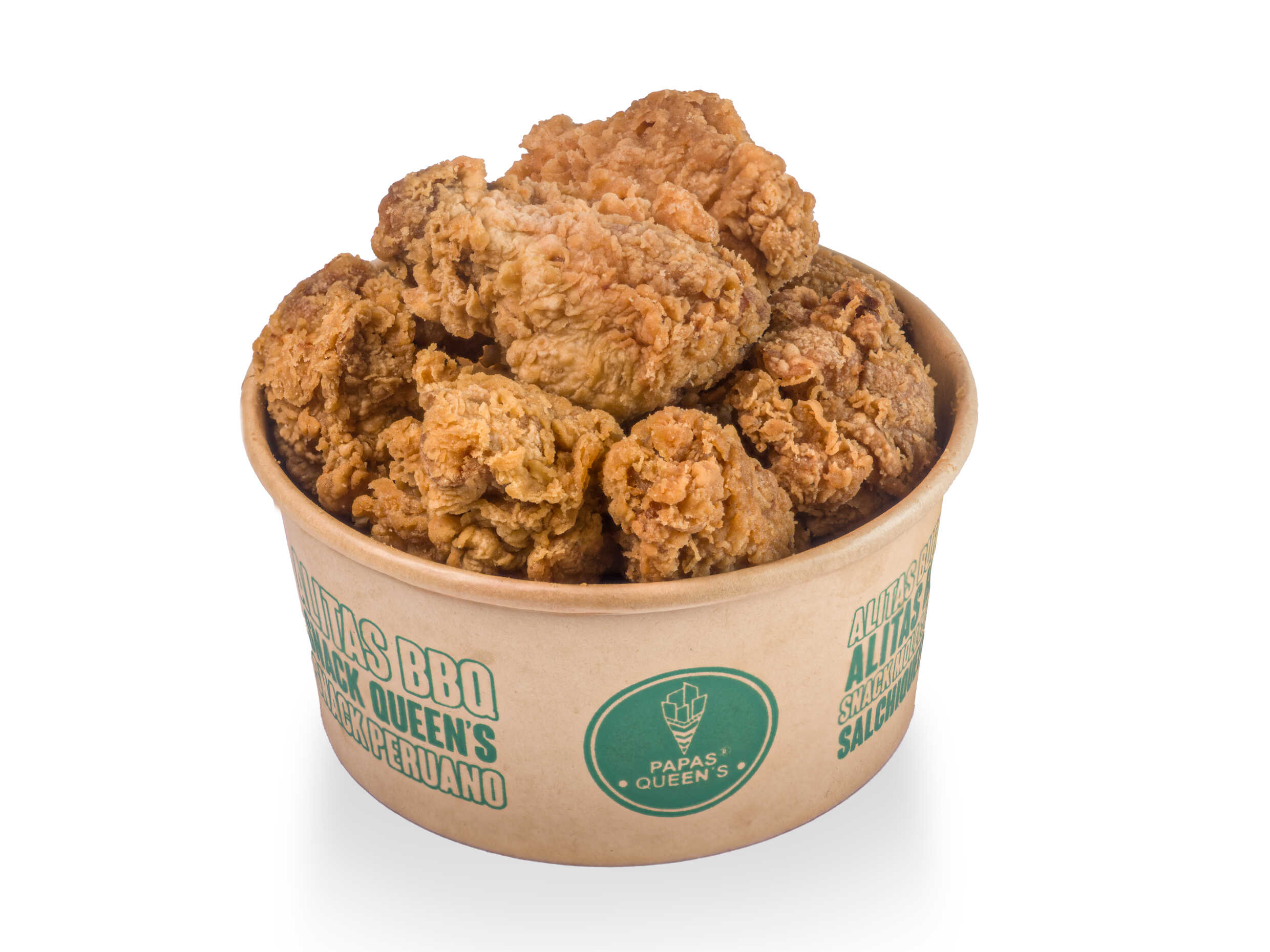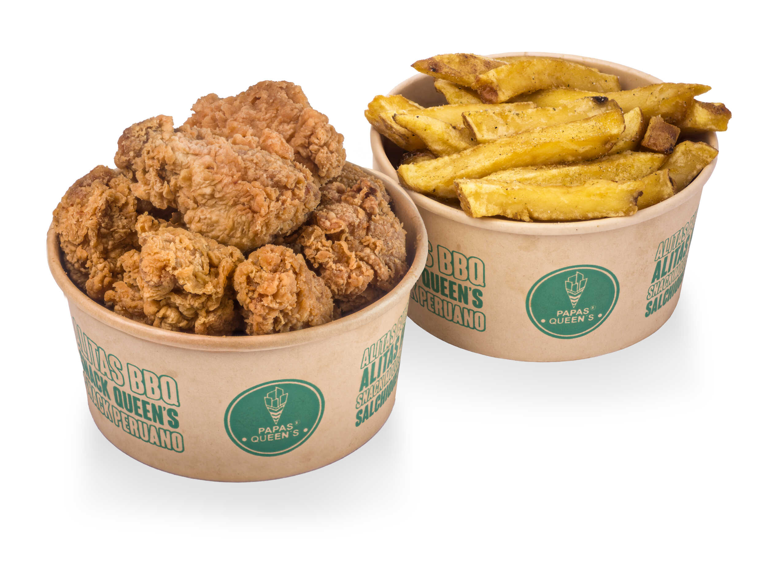 20 Alitas broasters, 8 chicken fingers, 2 chaufas familiares, 4 bebidas de 12 oz más 1 porción de papas familiares.