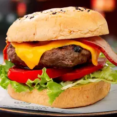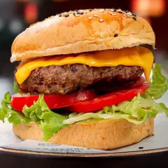 Jugosa carne, queso cheddar, lechuga, tomate, salsa de la casa más esponjoso pan de la casa.