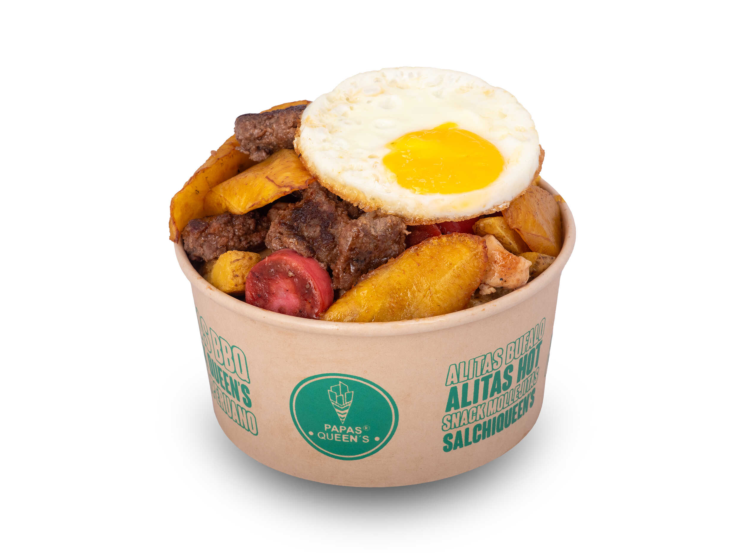 Todos nuestros conos vienen con papas artesanales, cremas y bebidas de 12 oz. Chorizo, hamburguesa, trozos de pollo, huevo, plátano más salsa BBQ.