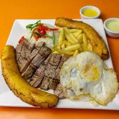 Lomo a la parrilla con huevo, papas, plátano, arroz más bebida.