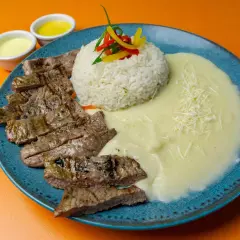 Lomo a la parrilla con espagueti a la huancaína
