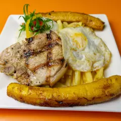 Chuleta huevo, plátano, papas fritas y arroz.