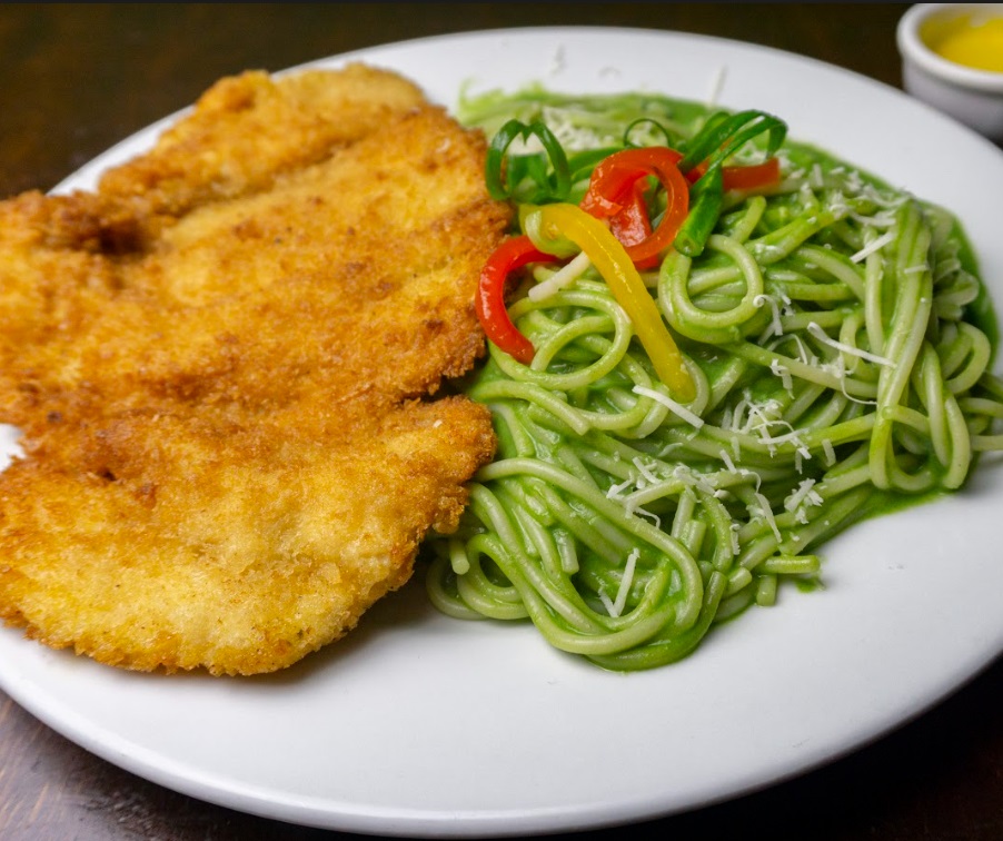 Milanesa de pollo con espagueti al pesto