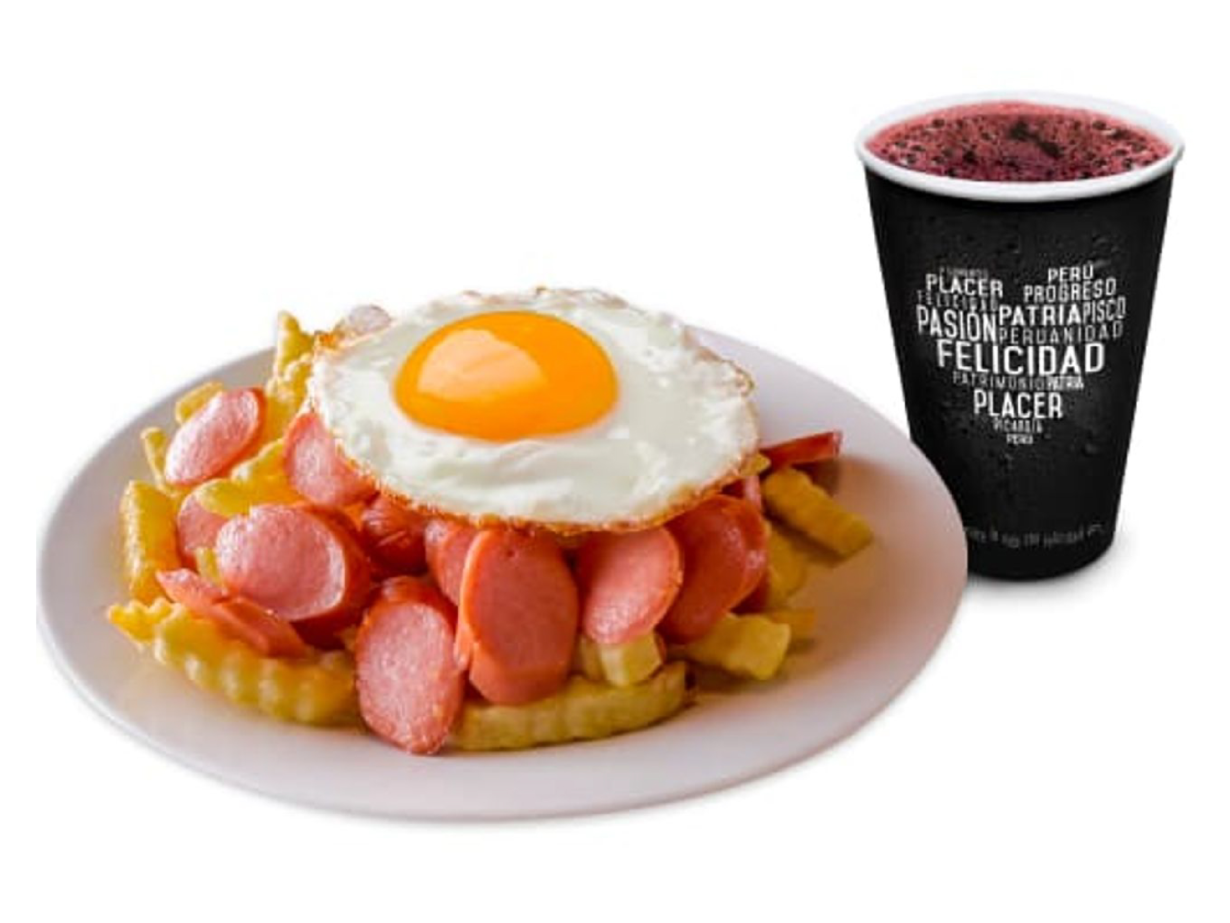Salchipapa Especial Hot dog, huevo frito, papas fritas y bebida regular (12 oz).