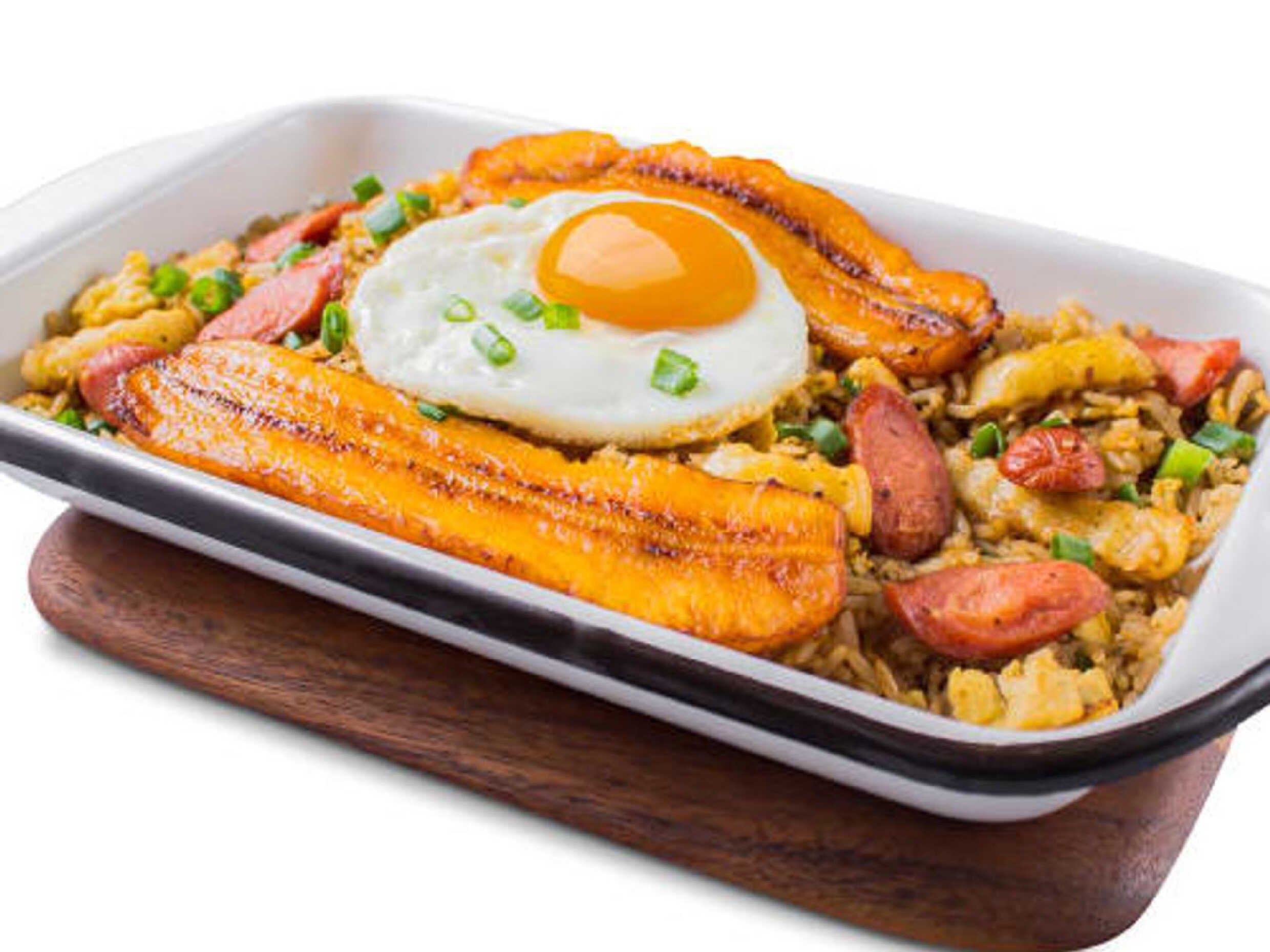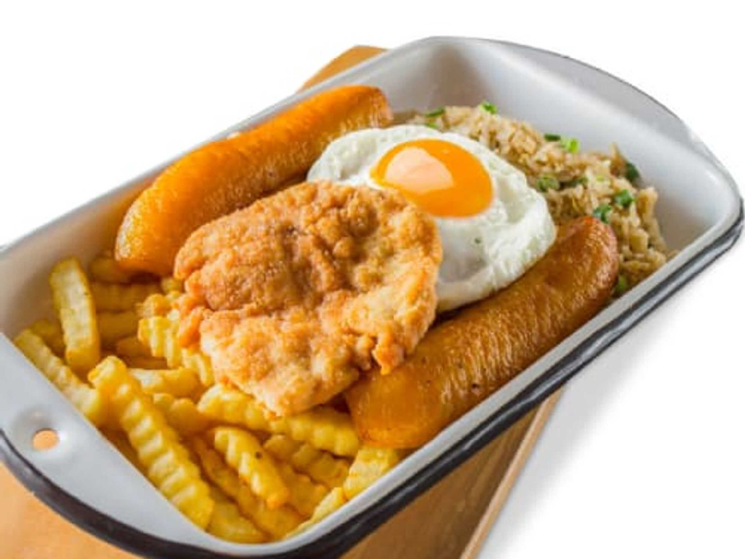 Arroz chaufa, apanado de pollo, papas fritas, huevo y plátano frito.