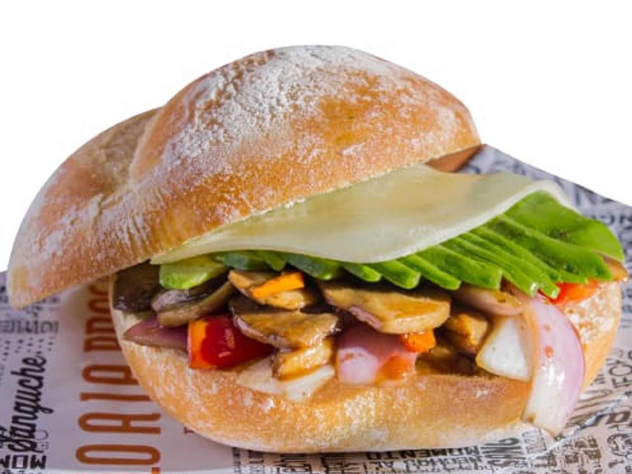 Salteado de cebolla, tomate, ají amarillo y champiñones con queso edam y palta.