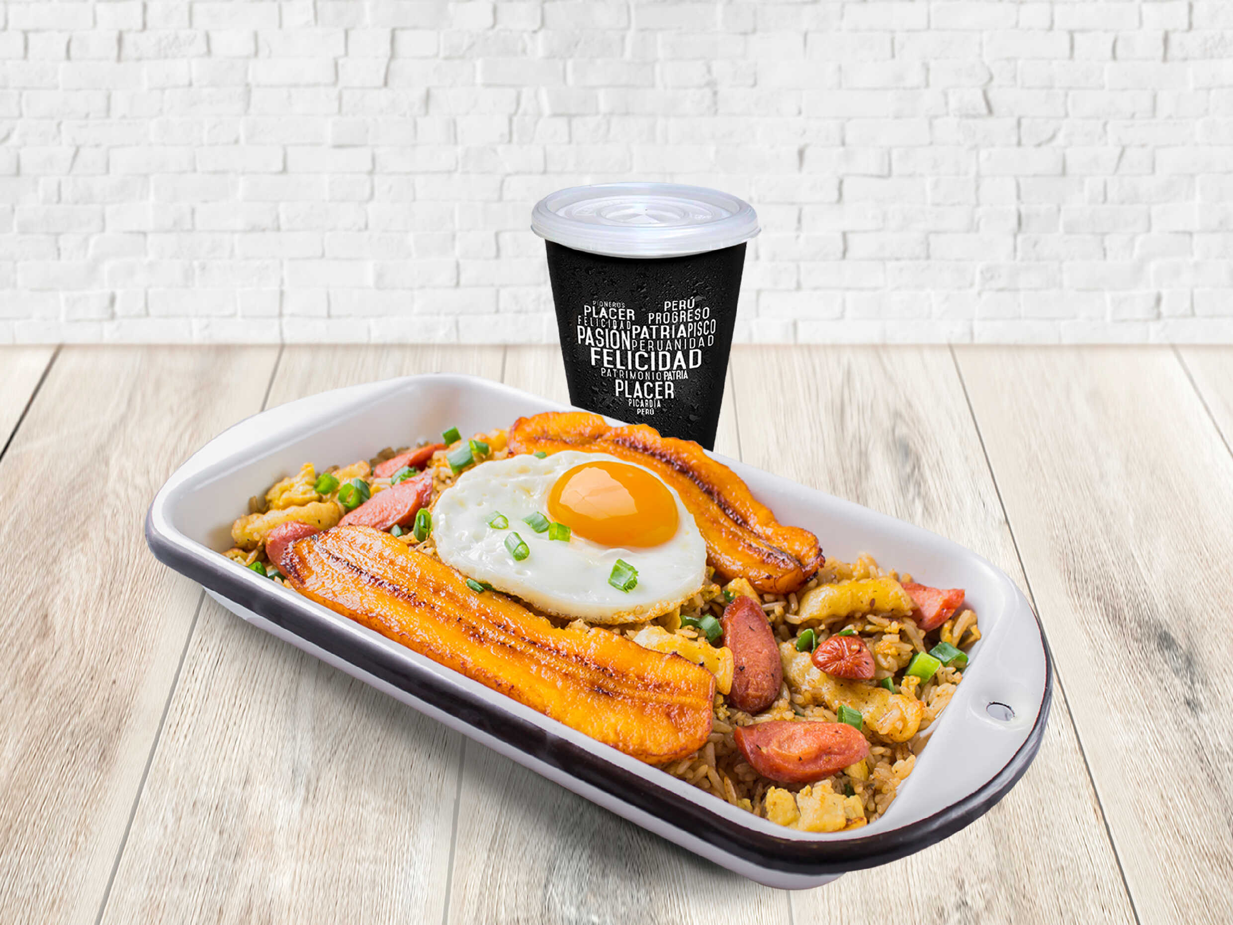 Arroz chaufa con papas fritas + hot dog + huevo frito y platano frito + bebida regular (12 oz).