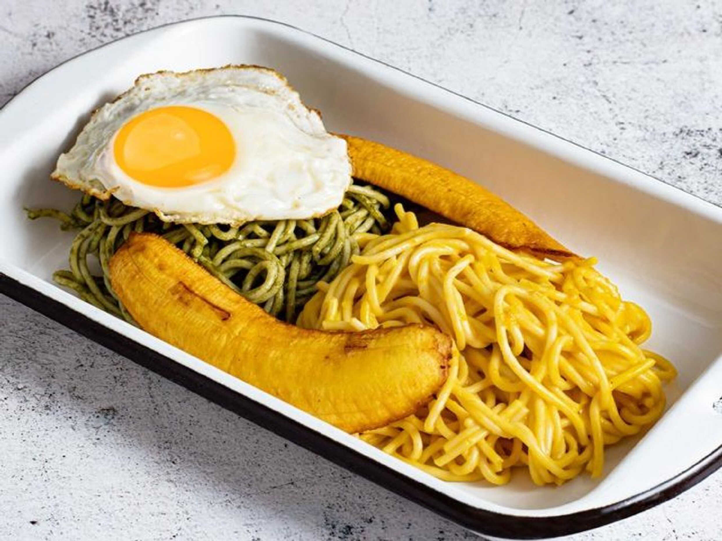 Tallarines huancaína y verdes con huevo y plátano frito, una fusión peruana colorida y llena de sabor.