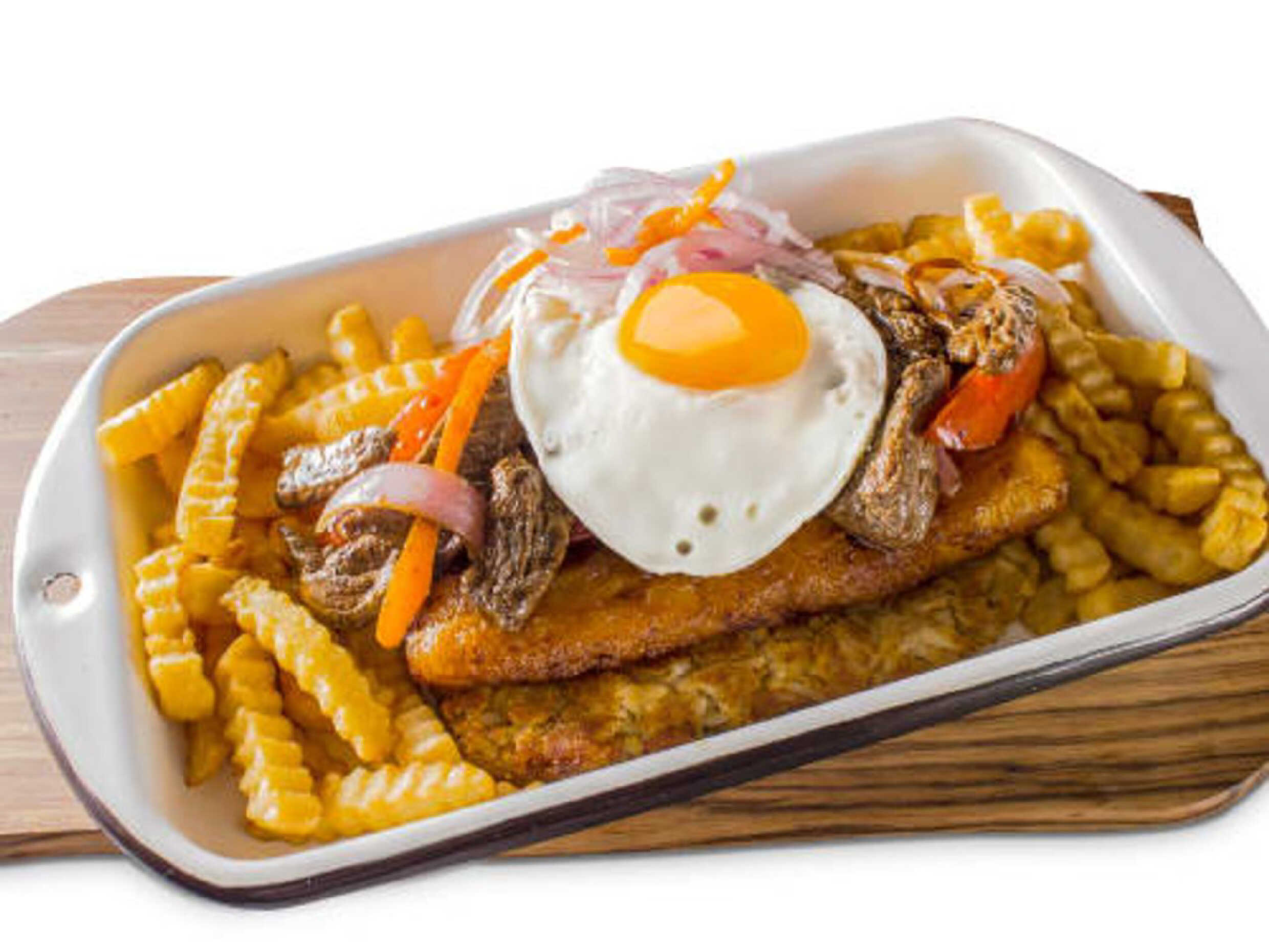 Tacu tacu con papas fritas, 100 gr. de lomo saltado, huevo frito, plátano frito y sarsa de cebolla.