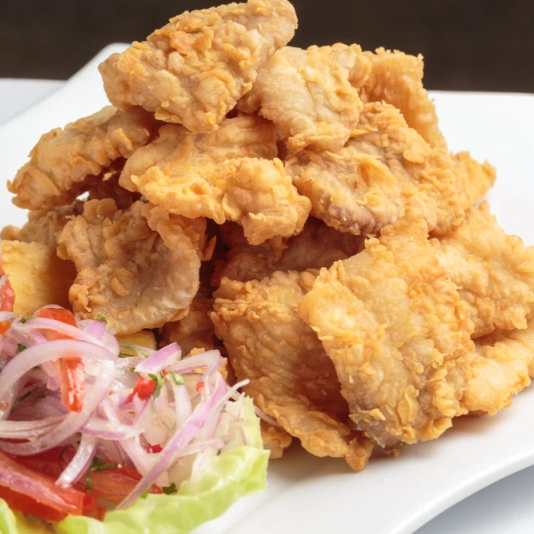 Piqueo ceviche de pota con chicharrón de pota en 2 Taper 8 Onz