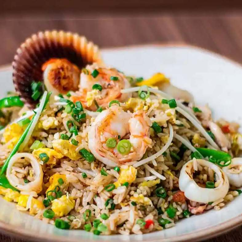 Chicharrón de pota con chaufa en 2 Taper 8 Onz
