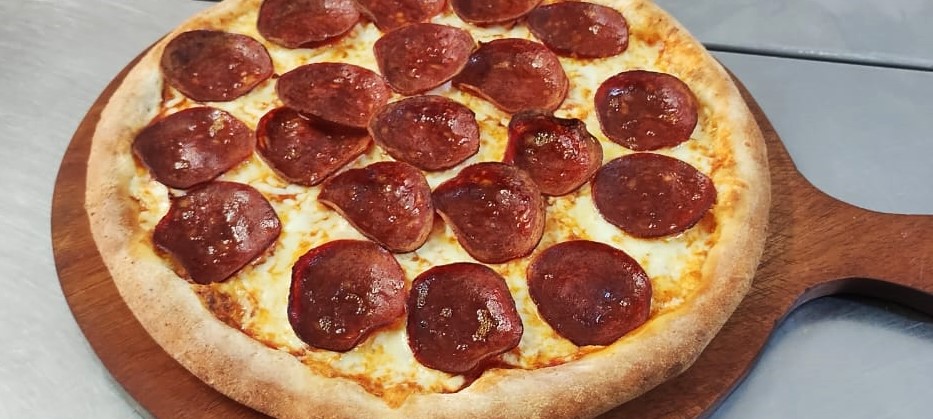 Ingredientes: queso mozzarella, cabanossi, chorizo, tocino y salsa pizzera.