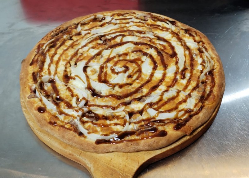 Ingredientes: queso mozzarella, jamón, trozo de pechuga de pollo, piña, cebolla blanca, salsa BBQ, y salsa pizzera.