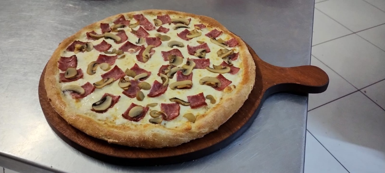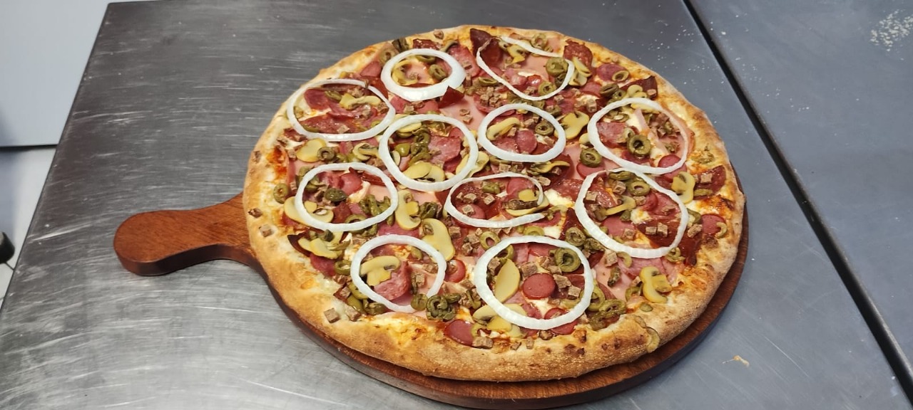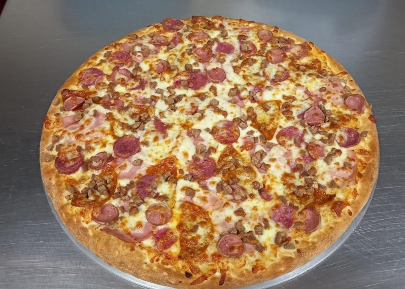 Ingredientes: queso mozzarella, jamón, pepperoni, salame, chorizo, tocino, carne pizzera, champiñones, aceituna verde, cebolla blanca y salsa pizzera.