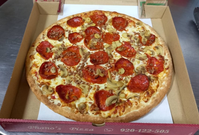 Ingredientes: queso mozzarella, pepperoni, carne pizzera, champiñones y salsa pizzera.