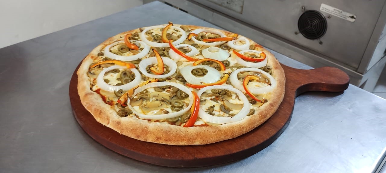 Ingredientes: queso mozzarella, champiñones, aceituna verde, pimiento, cebolla blanca y salsa pizzera.
