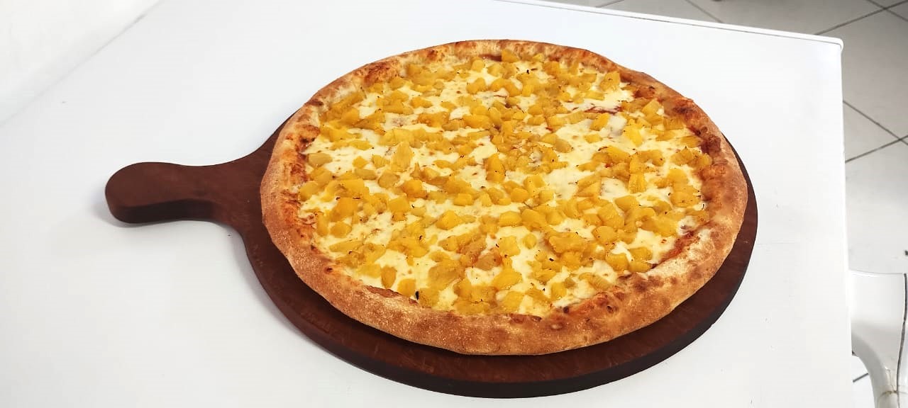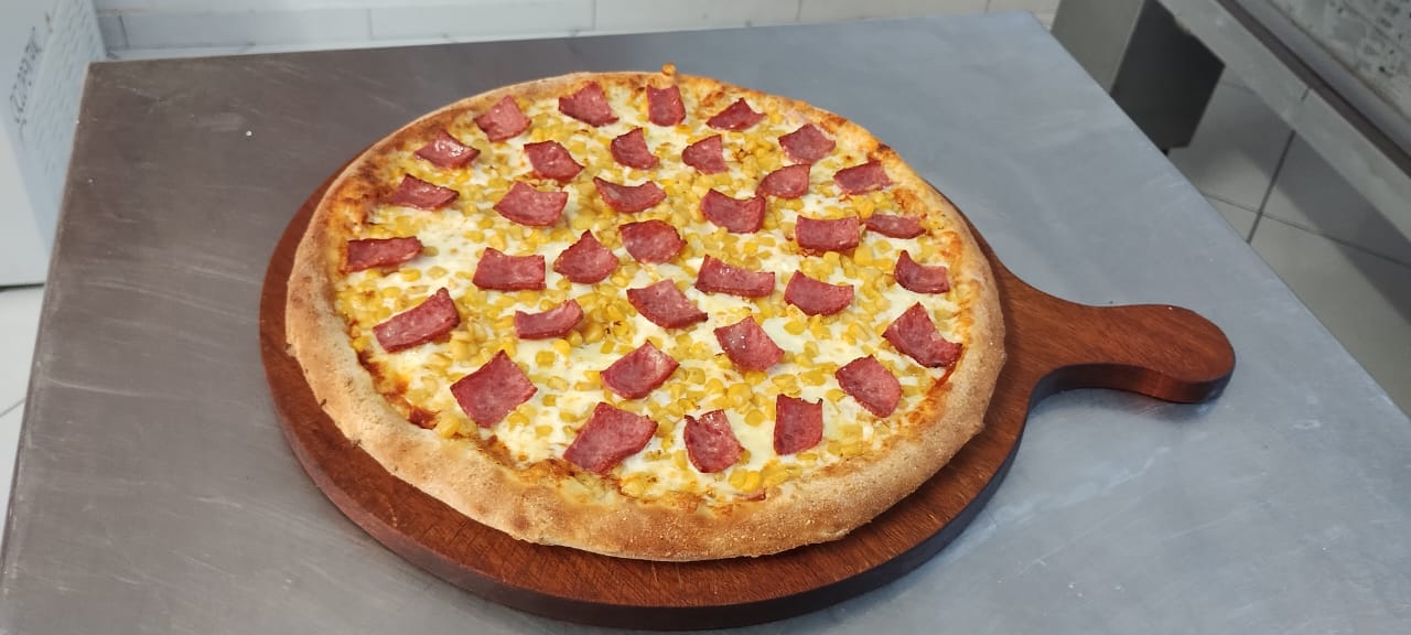 Ingredientes: queso mozzarella, jamón, maíz dulce, tocino y salsa pizzera.
