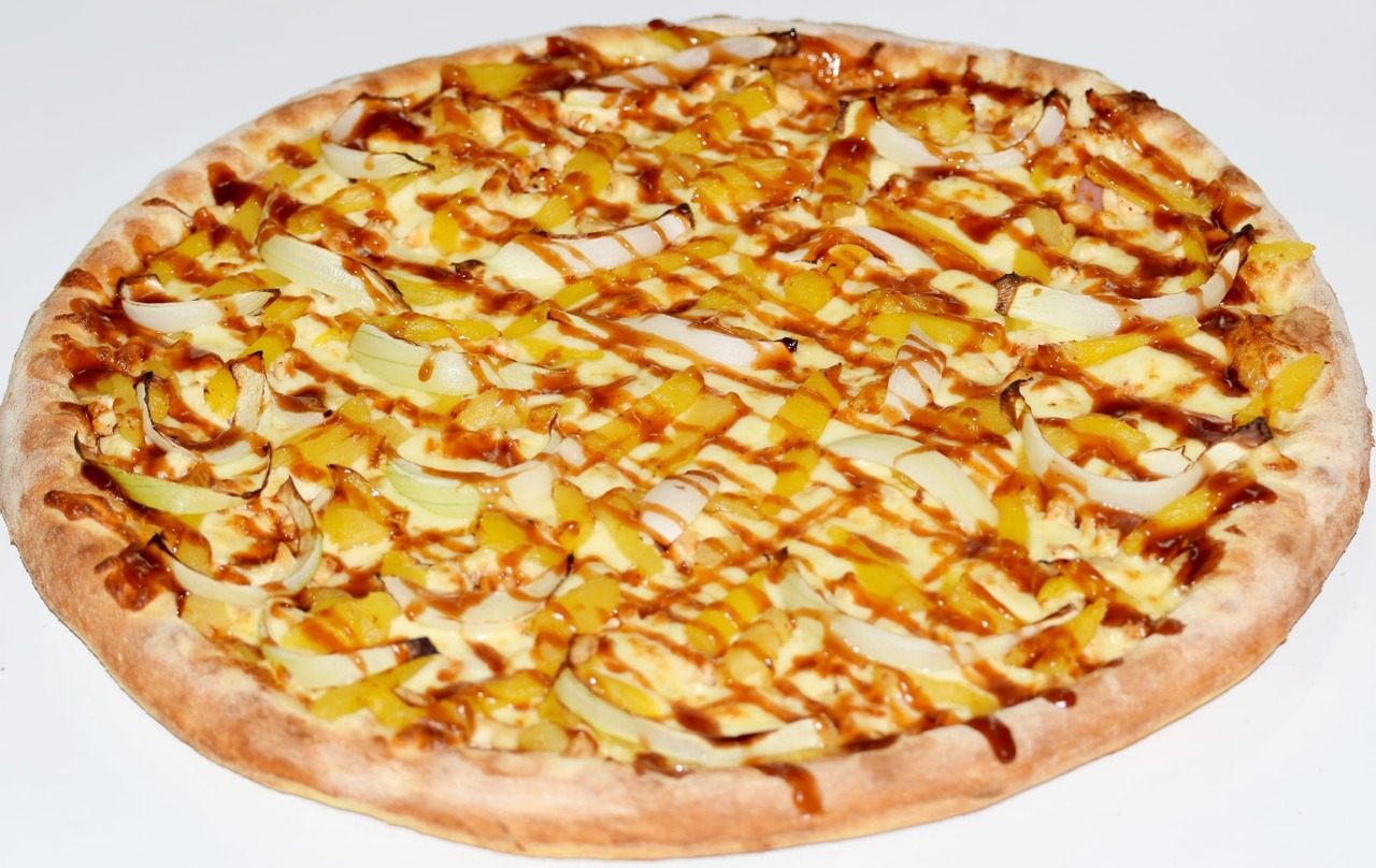 Ingredientes: queso mozzarella, jamón, trozo de pechuga de pollo, piña, cebolla blanca, salsa BBQ, y salsa pizzera.