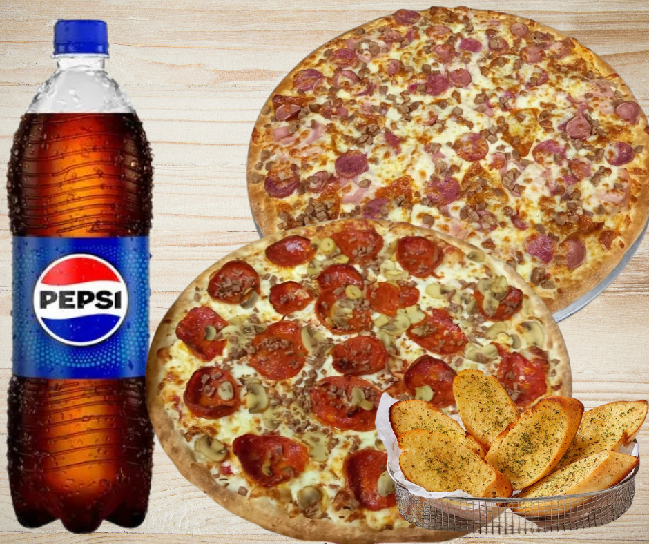 Pizza Familiar Clásica 10 Porciones c/u*2 + Pepsi 2 Lts*1 + Pan al Ajo Clásico 6 uds*1