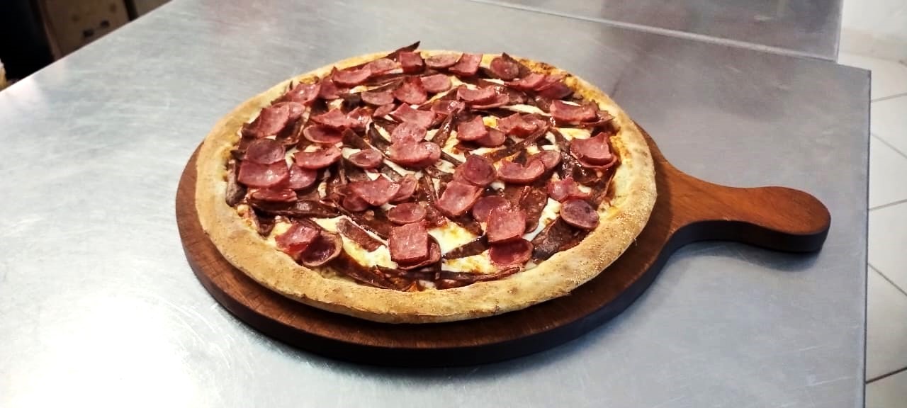 Ingredientes: queso mozzarella, cabanossi, chorizo, tocino y salsa pizzera.