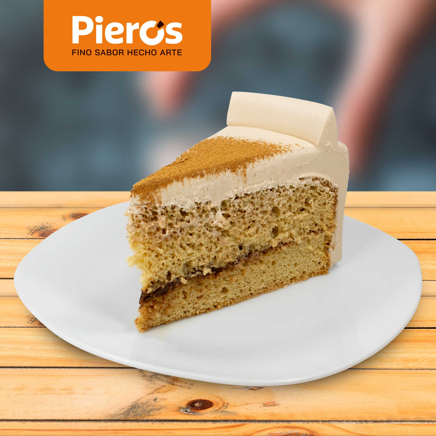 Bizcochuelo humedecido de leches, relleno de manjar blanco y decorado con canela, chocolatería Pieros.