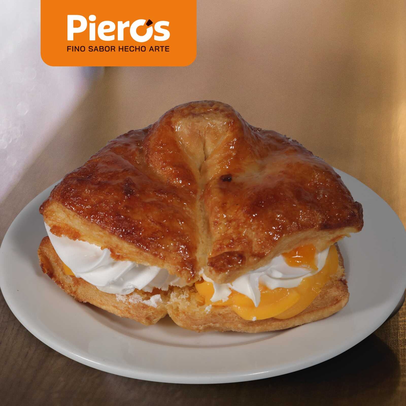 Pan acaramelado relleno con crema pastelera, chantilly y durazno.