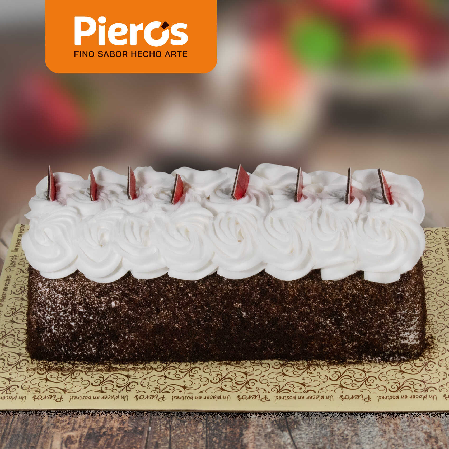 Bizcochuelo humedecido de leches, relleno de manjar blanco y decorado con canela, chocolatería Pieros.