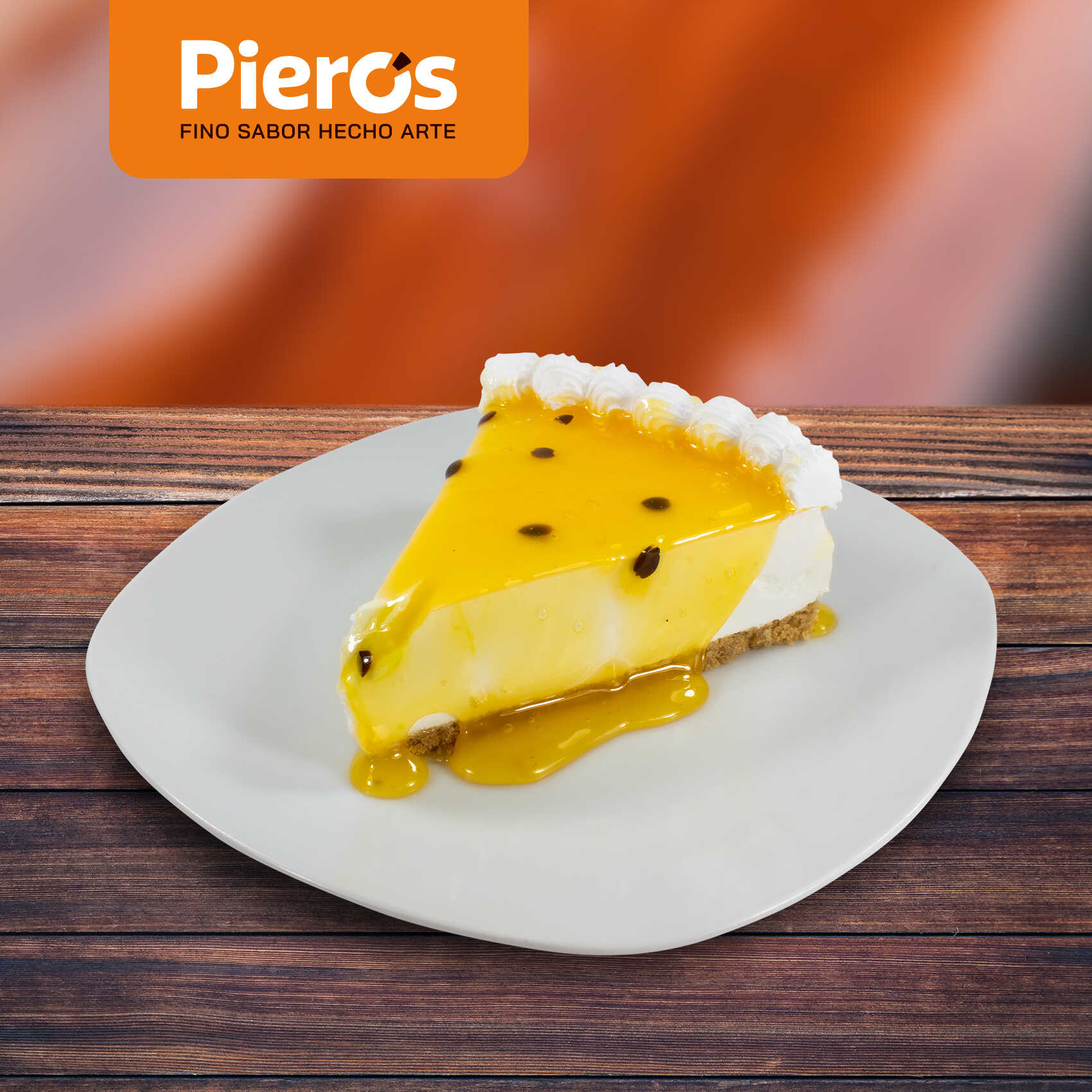 Base de galleta molida, queso crema, cobertura de jalea de maracuyá y chantilly.