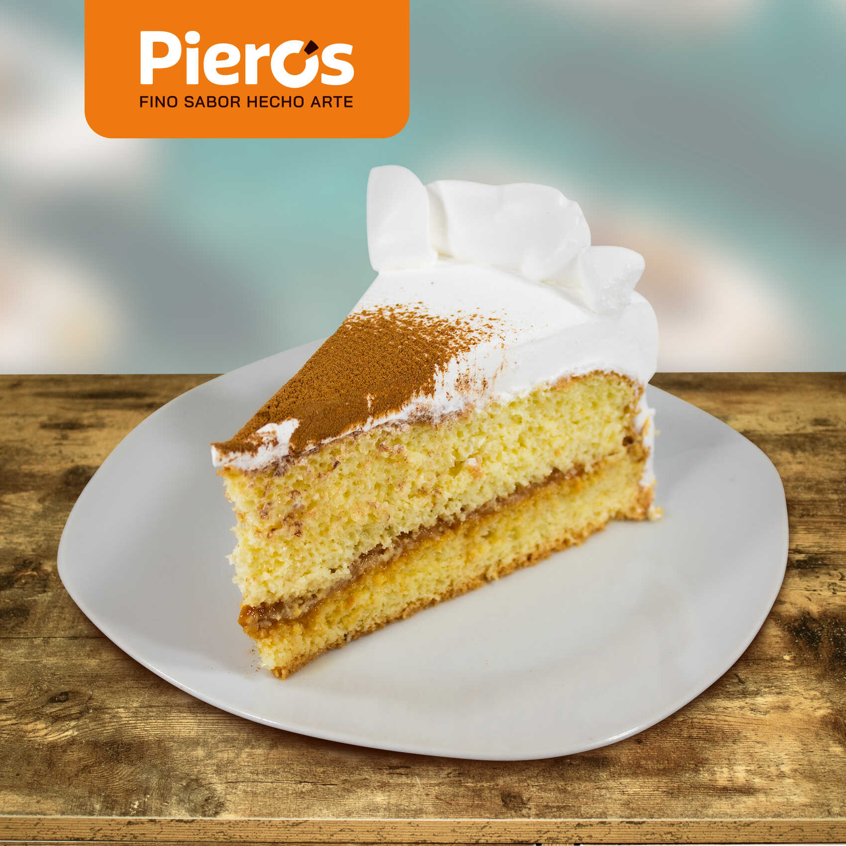 Torta d bizcochuelo humedecida de 4 tipos de leches, relleno de manjar blanco y decorado con canela.