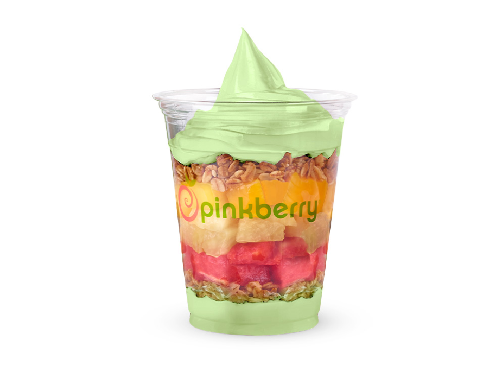 Frozen Yogurt de sabor Manzana Verde, acompañado de granola y 3 topping de frutas a elección.