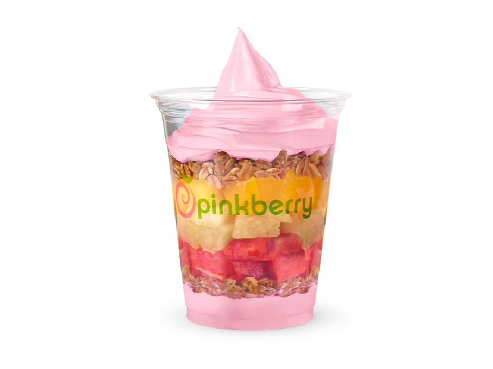 Frozen Yogurt de sabor Fresa, acompañado de granola y 3 topping de frutas a elección.