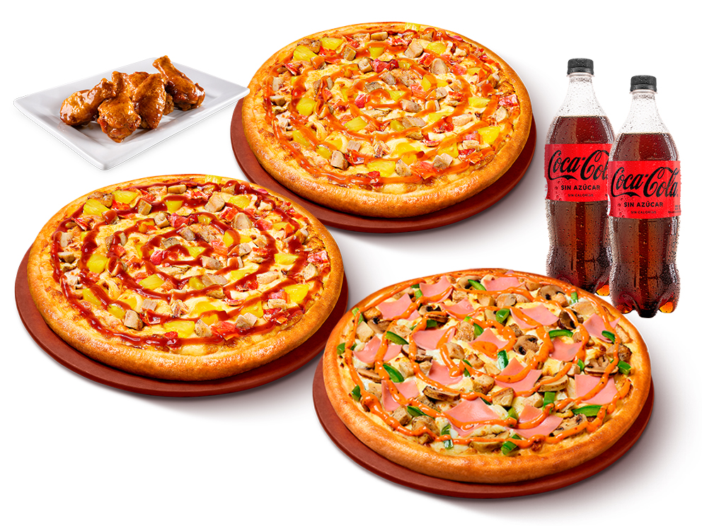 ¿Plan con amigos? 3 Pizzas Grandes Chicken Suprema, 1 bebida de 1L y 6 Alitas.