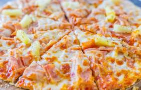 Queso mozzarella, queso parmesano, jamón, piña y salsa pizzera.