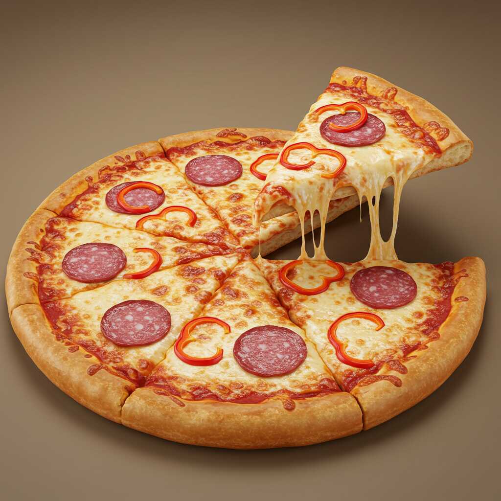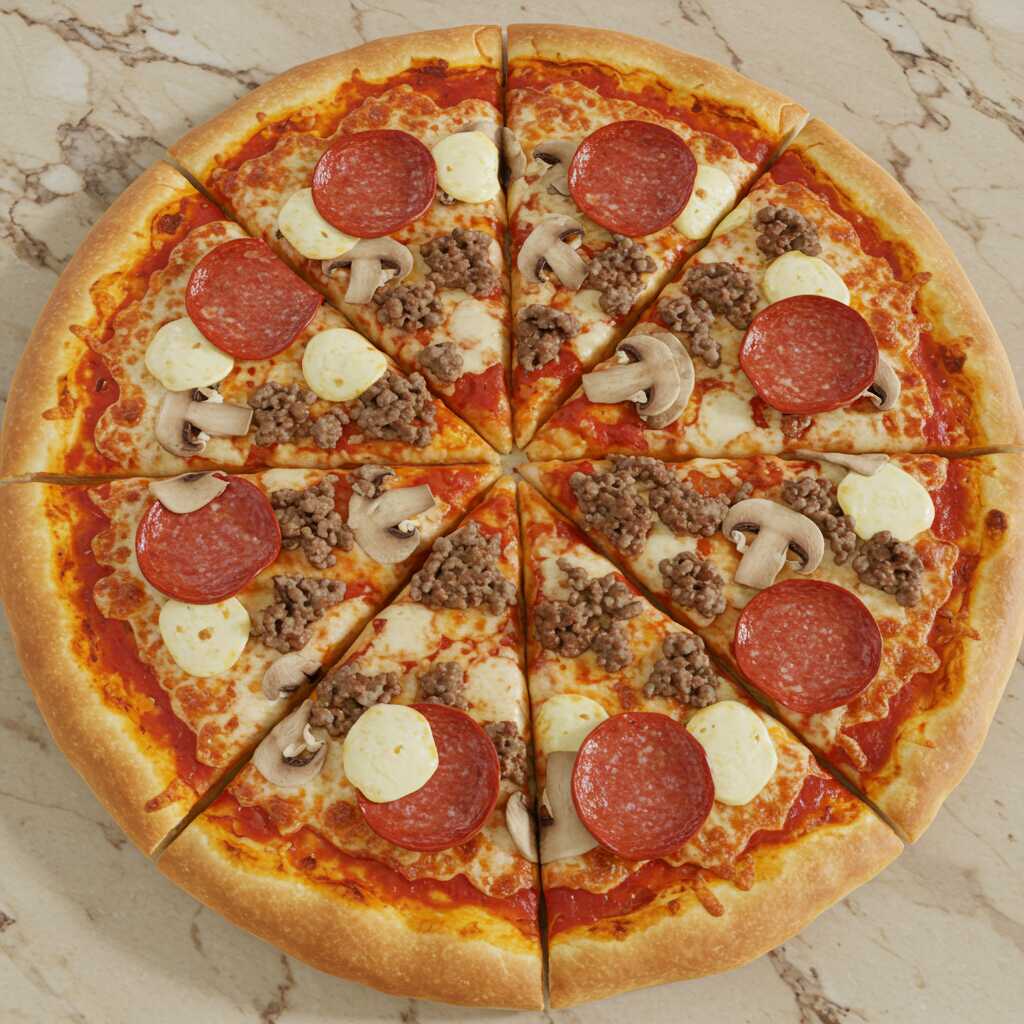 Ingredientes: queso mozzarella, queso parmesano, pepperoni, champiñones, carne pizzera y salsa pizzera.
