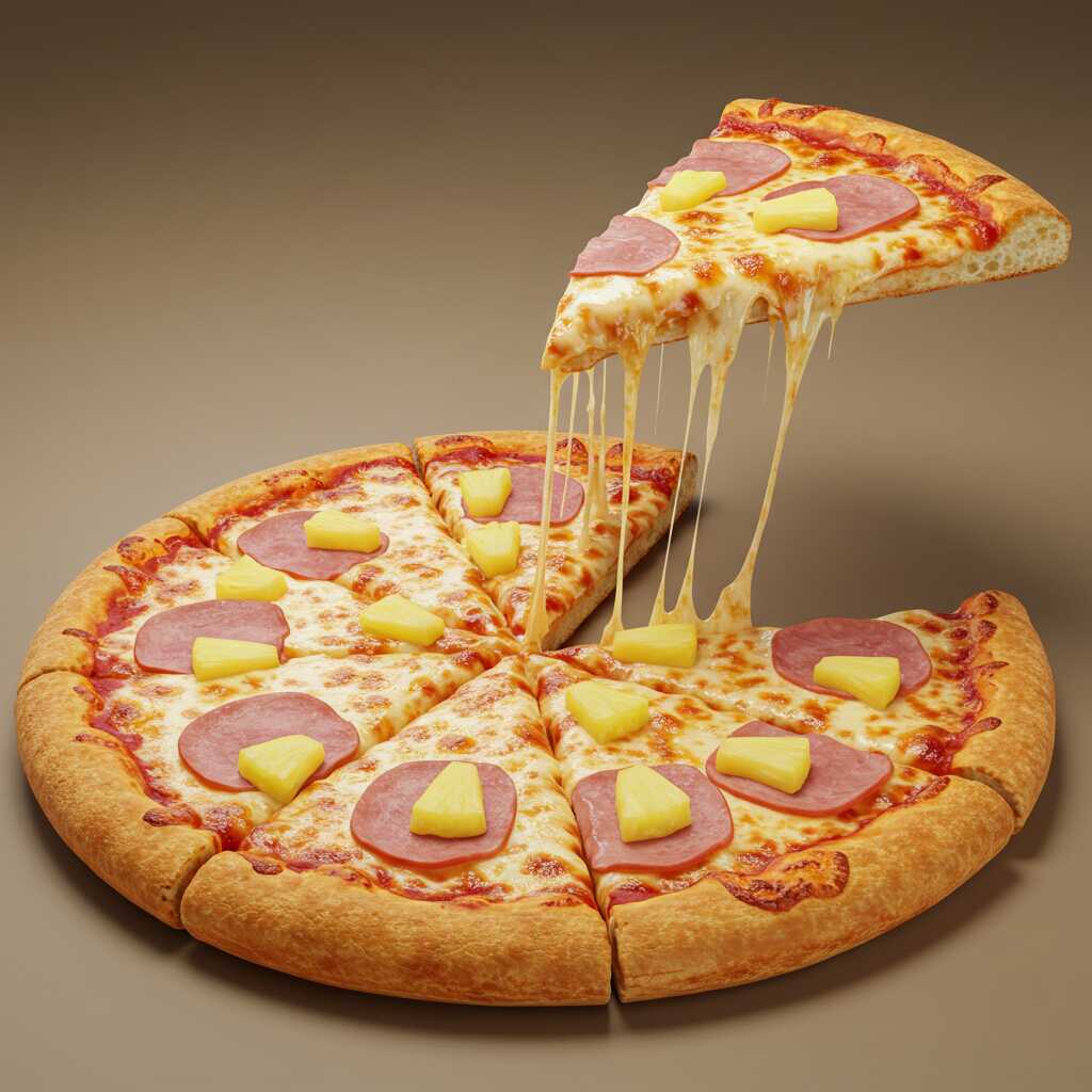 Ingredientes: queso mozzarella, queso parmesano, jamón, piña y salsa pizzera.