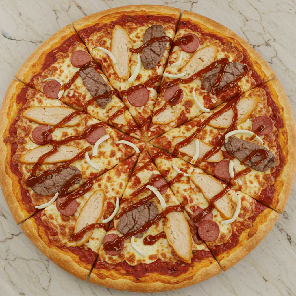 Queso mozzarella, queso parmesano, pollo, hot dog, cebolla blanca, lomo fino, salsa pizzera y salsa barbacoa.