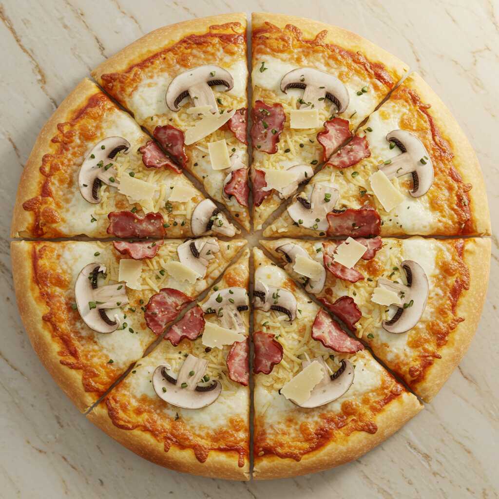 Ingredientes: queso mozzarella, queso parmesano, salsa blanca, champiñones y tocino.