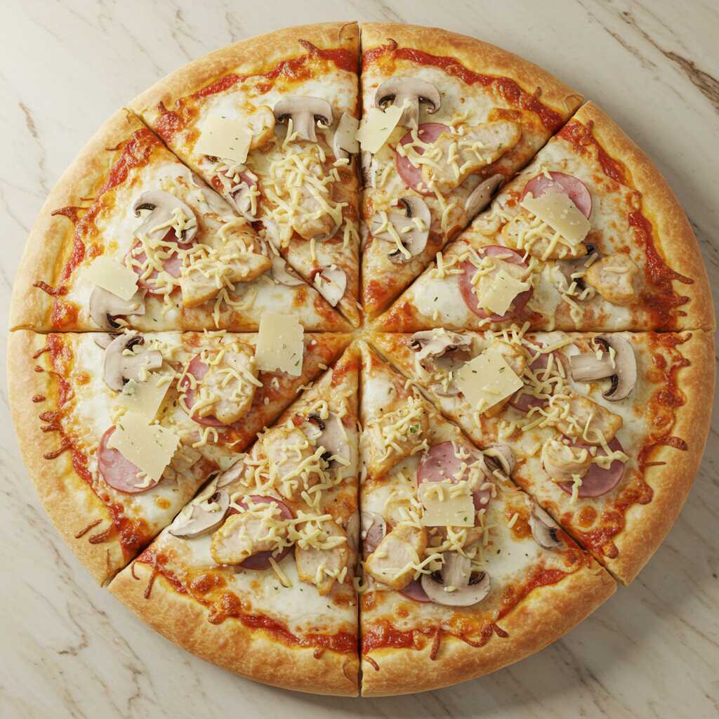 Ingredientes: queso mozzarella, queso parmesano, pollo, jamón, champiñones y salsa blanca.