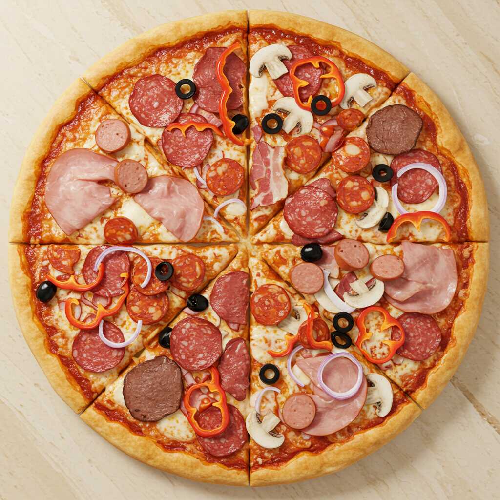 Ingredientes: queso mozzarella, queso parmesano, jamón, pepperoni, chorizo español, hot dog, tocino, lomito ahumado, salame, carne pizzera, pimientos, cebolla blanca, aceituna, champiñones y salsa pizzera.