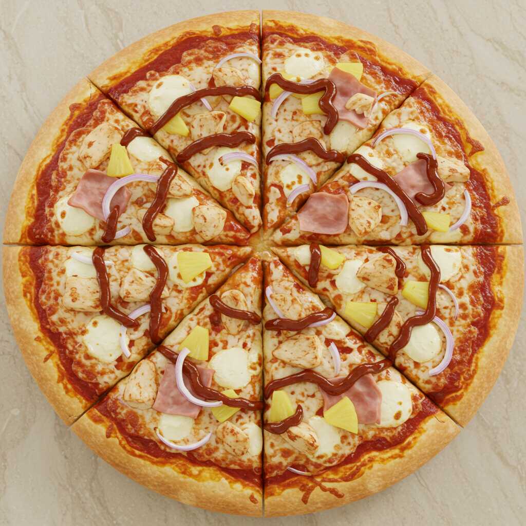 Queso mozzarella, queso parmesano, pollo, jamón, piña, cebolla blanca, salsa pizzera y barbacoa.