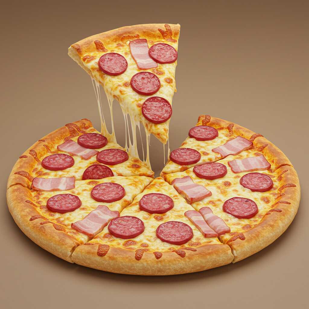 Ingredientes: queso mozzarella, queso parmesano, cabanossi, chorizo, tocino y salsa pizzera.